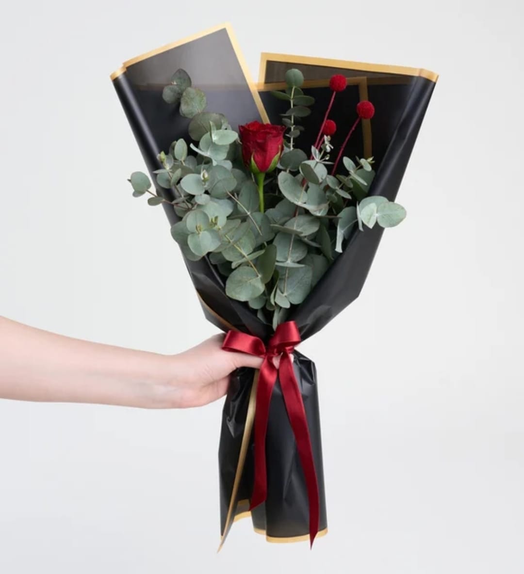 Tek Kırmızı Gül ve Okaliptüs Buketi